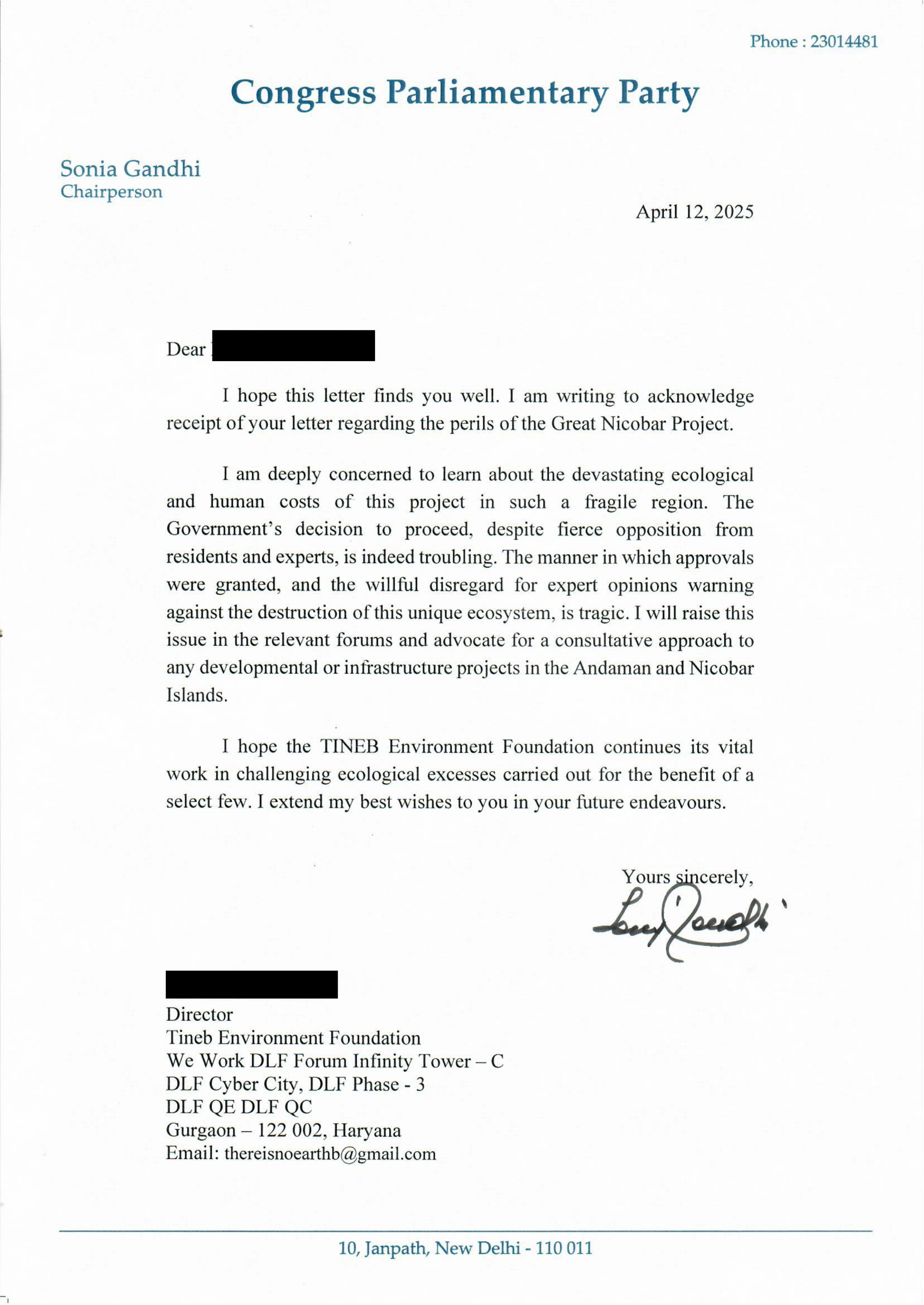 The Great Nicobar project has been a point of contention and concern in India for quite some time. On 2 April 2025, the climate justice organisation There Is No Earth B sent letters to 15 members of parliament urging them to take immediate action. The people’s movement has been highlighting the critical and escalating environmental and human rights issues caused due to this project and in a letter dated 12th April, 2025 has been recognised and responded to by Sonia Gandhi. Gandhi expressed “deep concern” over the “devastating ecological and human costs” of the project, criticized the “willful disregard for expert opinions,” and affirmed that she would “raise this issue in the relevant forums and advocate for a consultative approach” to development in the Andaman and Nicobar Islands.